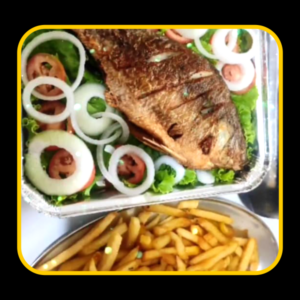 Peixe Tilápia inteiro com fritas e salada verde do Rubacão Paraibano